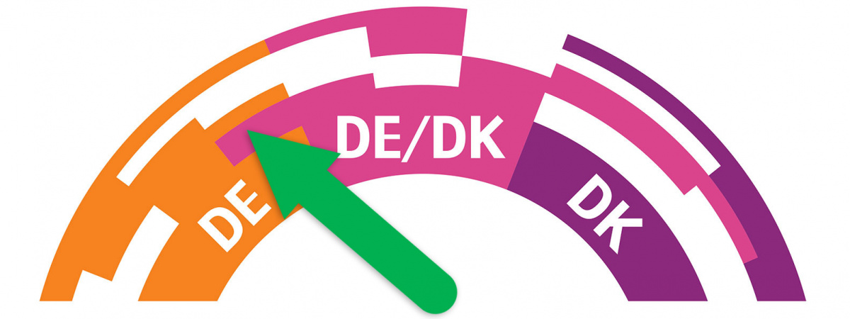 - Der Lehrer kann den Pfeil in die Mitte stellen auf DE/DK. Hier spricht der Lehrer Deutsch während die Schüler selber entscheiden können ob sie Deutsch oder Dänisch sprechen.