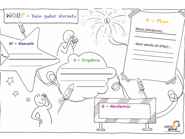 Eine empfohlene Methode ist „WOOP“. Dabei formuliert man erst ein Ziel. Im zweiten Schritt stellt man sich das Ergebnis vor. In einem dritten Schritt überlegt man, was ein Hindernis sein könnte, das Ziel zu erreichen. Im letzten Schritt formuliert man, wie man auf dieses Hindernis reagiert.